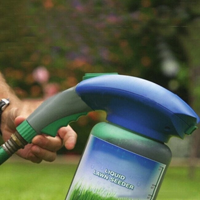 Spray-on grass seed, often known as “hydroseeding” is the process of spreading grass seed using a pre-mixture liquid. It’s like spray painting your lawn but instead of paint it’s a mixture of (mostly) water, grass seed, mulch, bonding agent, so the water pressure available through a garden hose is enough to spread the mixture.
